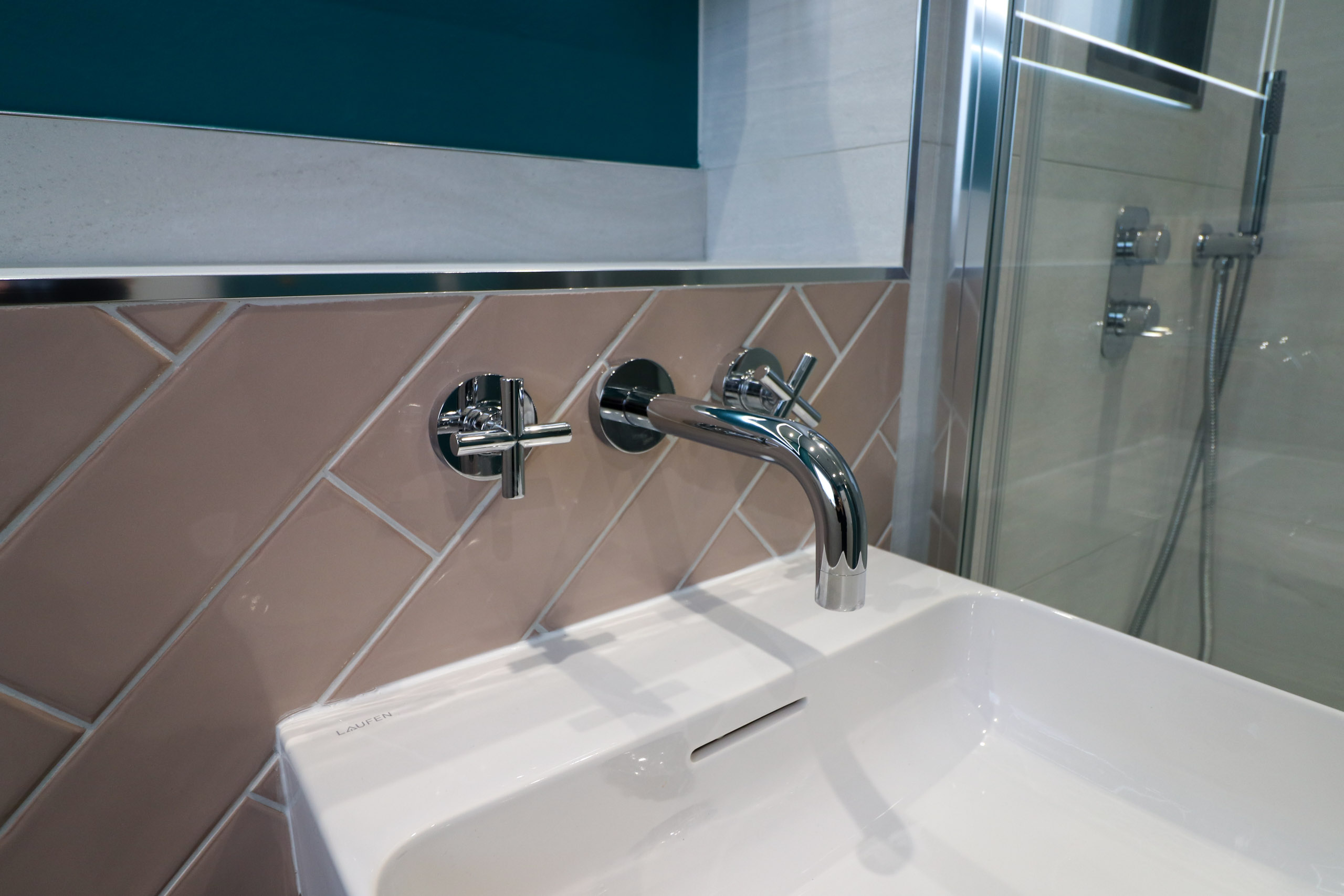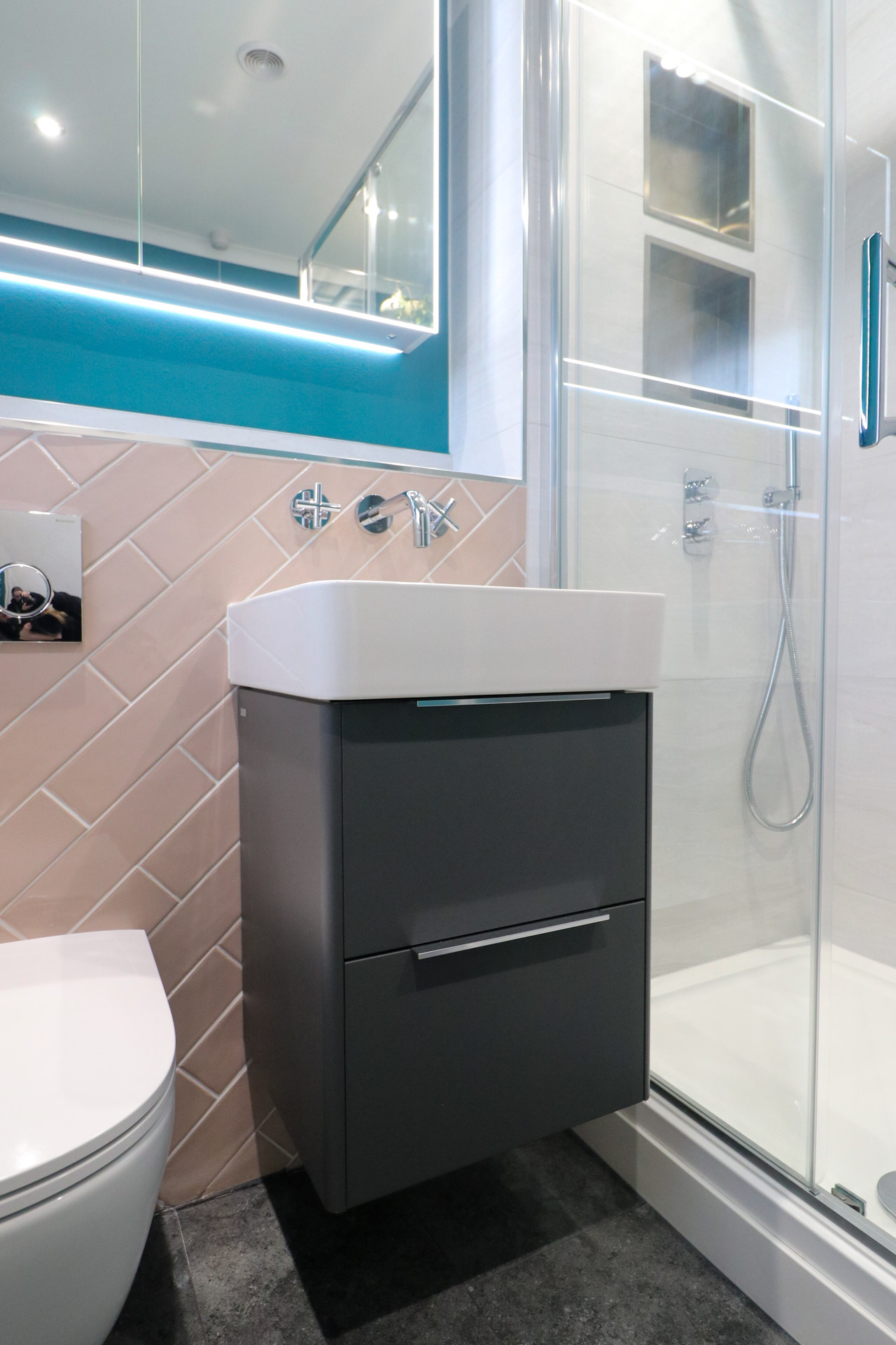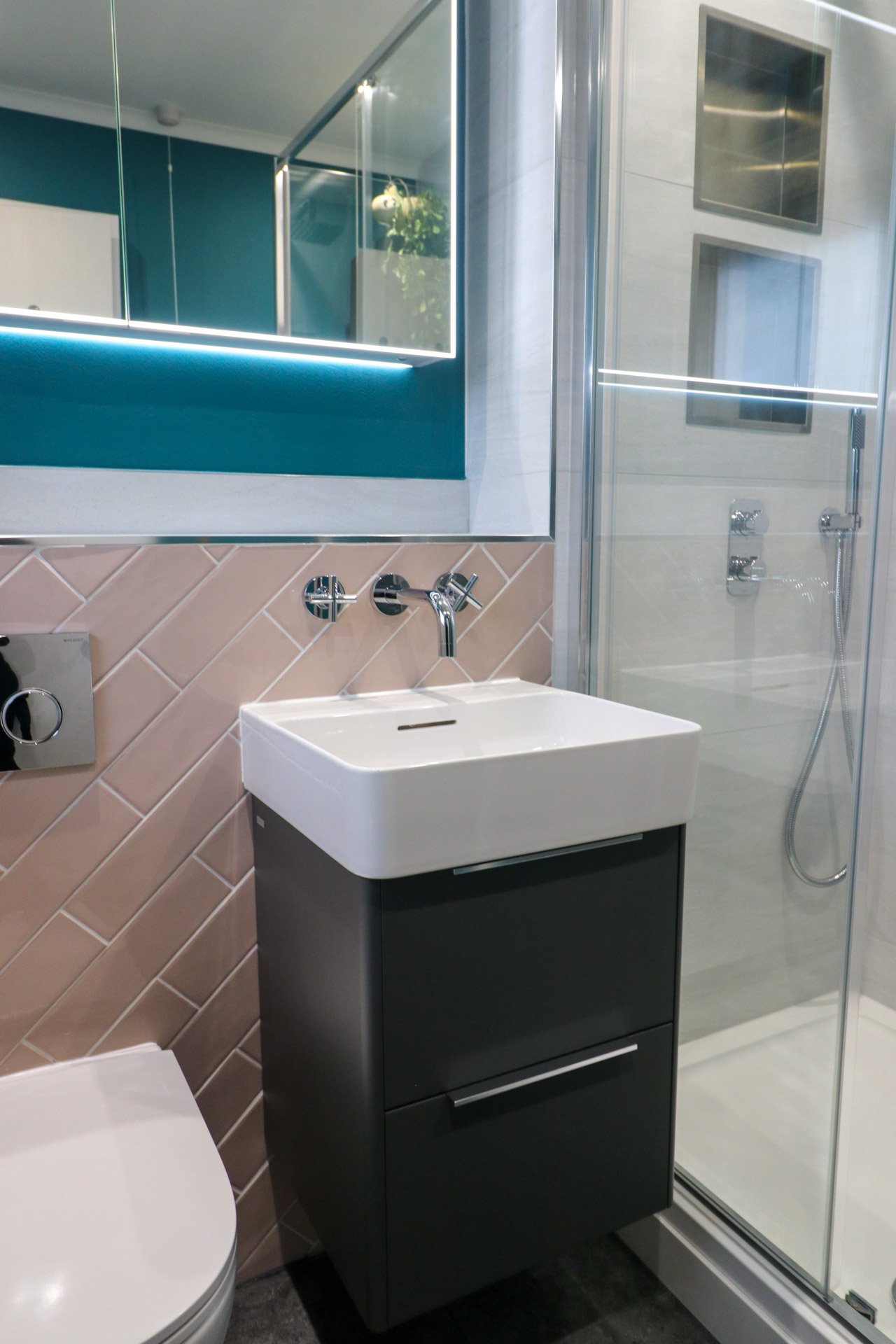 Their basin unit was from Laufen, finished in the shade Traffic Grey, with soft close drawers. A Laufen basin was installed on top of the unit along with a Vado mixer tap finished in chrome, which was wall mounted, too.