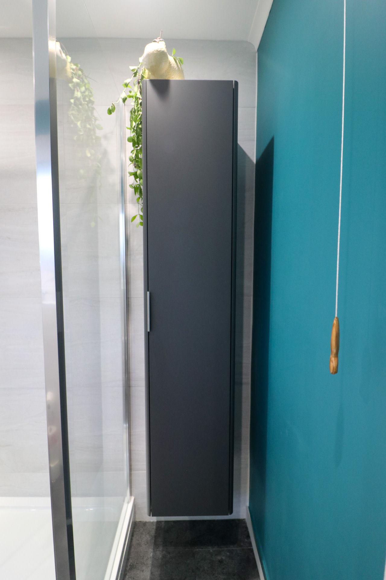 In the corner of the room, a wall hung tall unit was installed, also from Laufen and finished in the same shade to add more storage solutions.