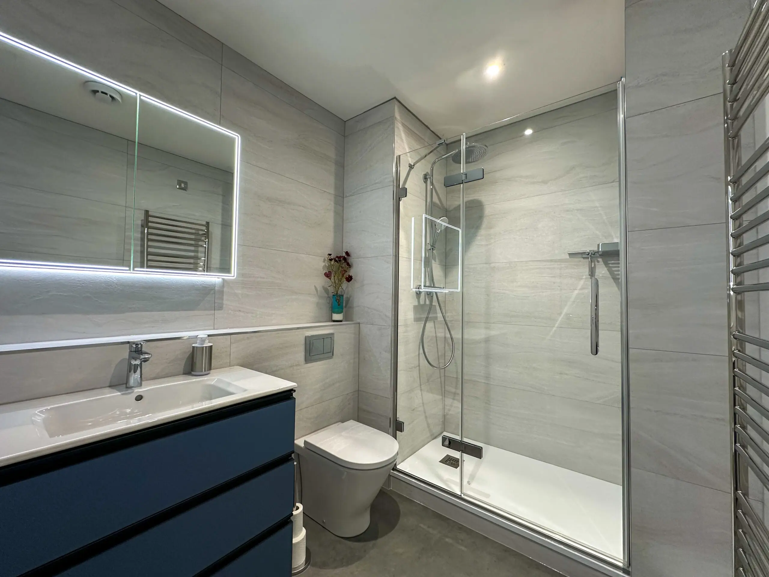 For the finishing touches in the room, a JIS towel rail was installed. Spotlights were installed to enhance the ambience and an illuminated mirror from Hib was hung above the basin unit to complete the room.