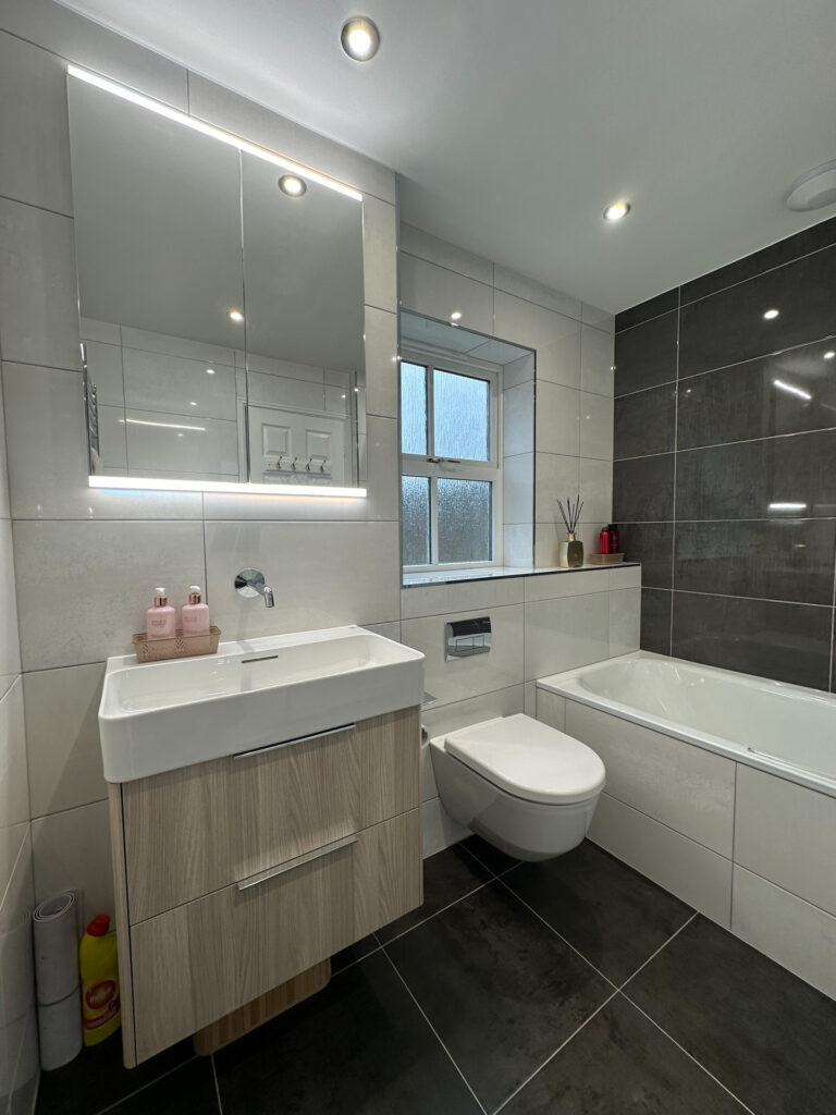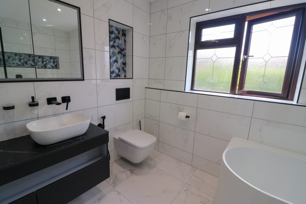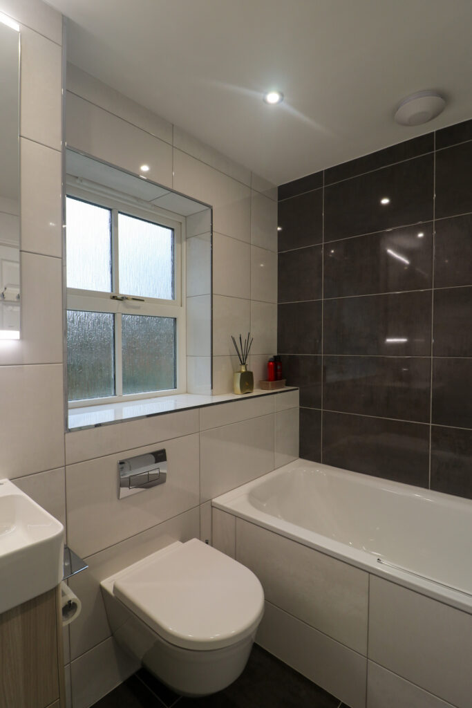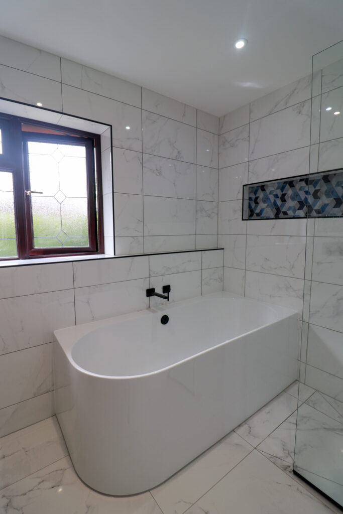 We began the year completing two beautiful bathrooms for our client in Milton Keynes. Their first bathroom was their main family bathroom which was finished with contrasting tiles. Designed by Chris, our client opted for their two new rooms to be similar styles, but this one had a Bette bath installed, with an Axor overhead shower.