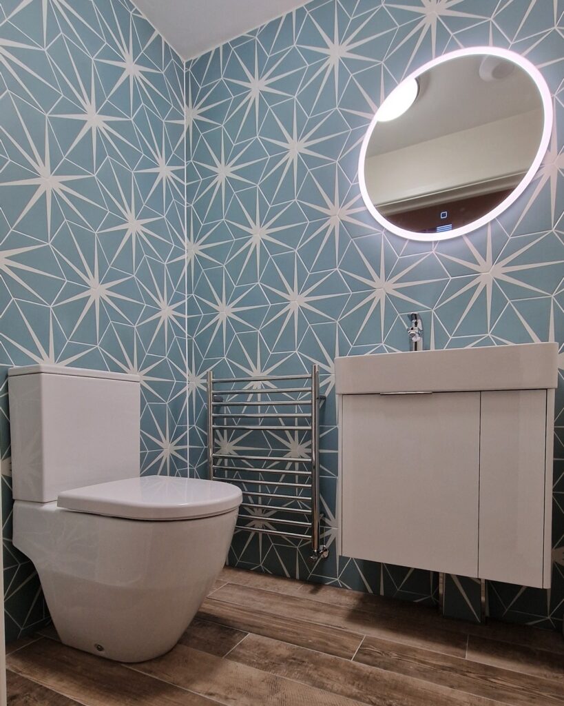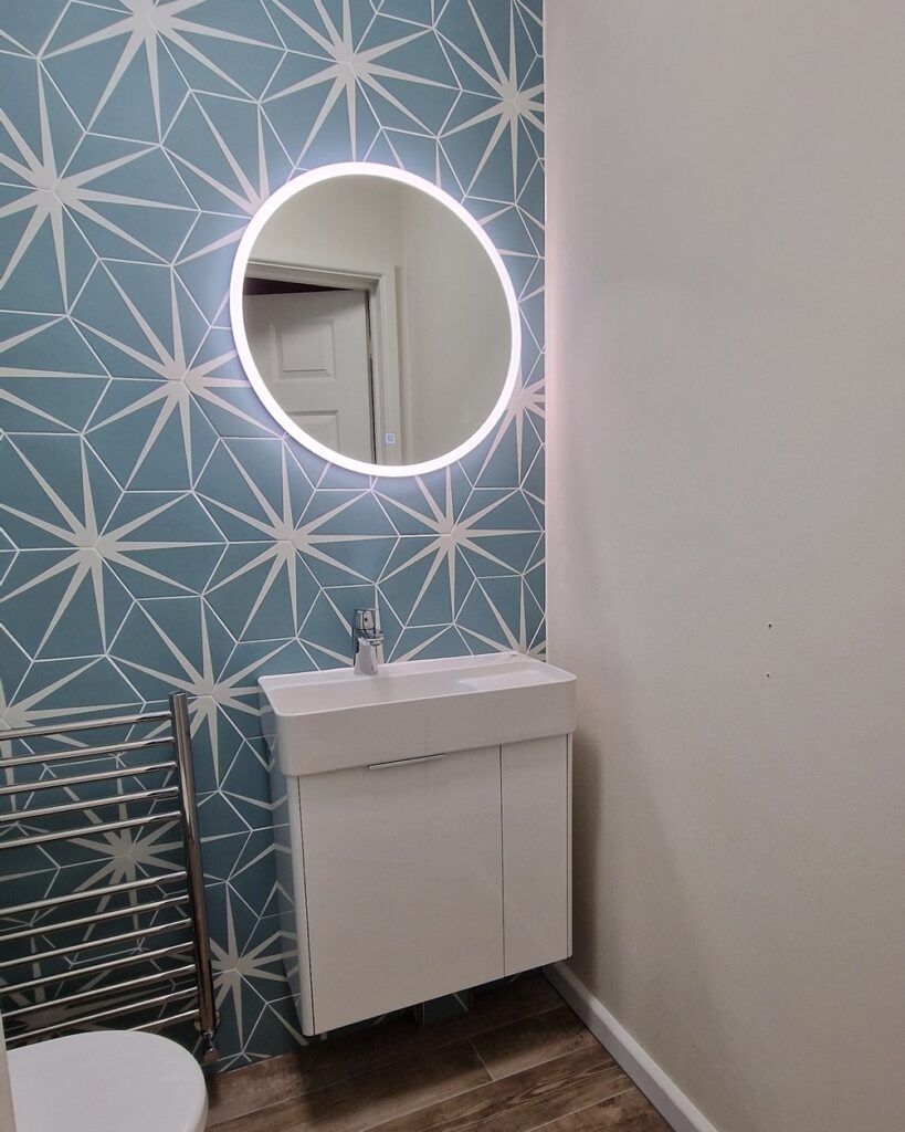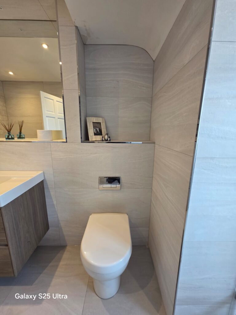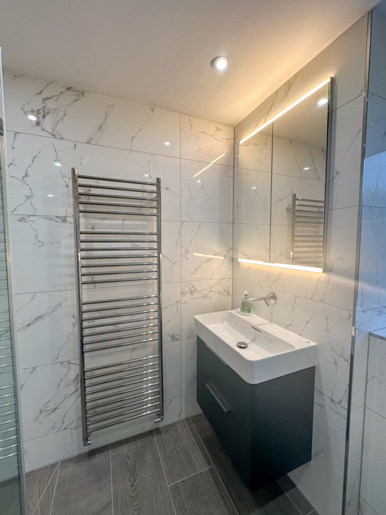 The installation of a wall-hung vanity from Laufen, paired with a Grohe mixer tap, added a sleek and contemporary feel. Above the basin, a glamorous Hib illuminated mirror was installed to enhance the rooms design, offering both elegance and practicality.