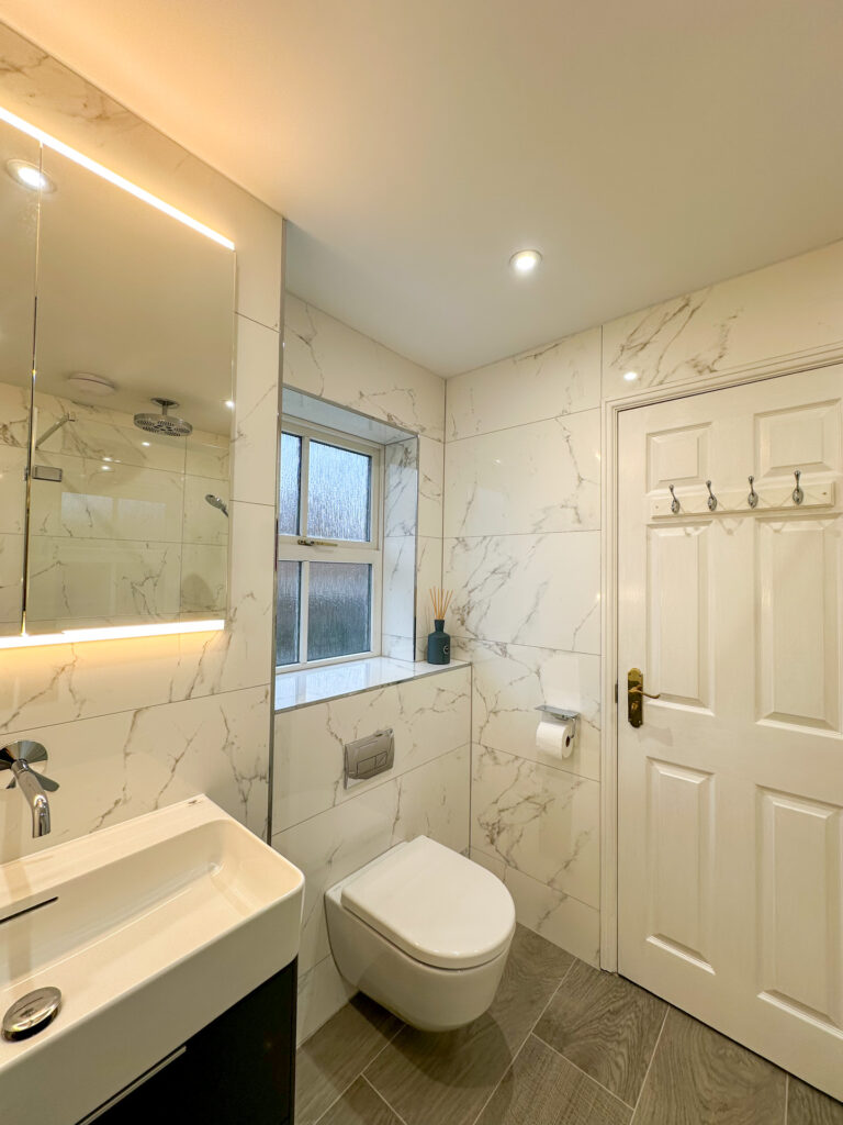 Throughout the entire room, light coloured, large format marble effect Porcelanosa tiles were installed, adding to the sophisticated, modern theme. The lighter tiles instantly transformed the interior space, elevating and brightening up the bathroom.