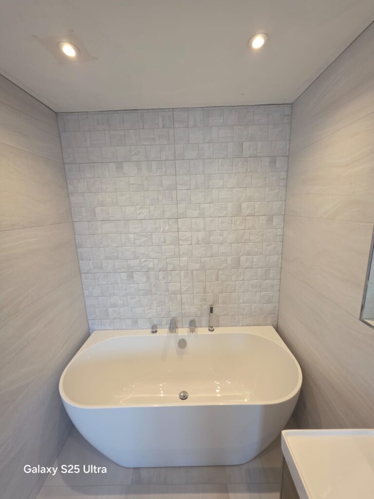 For their final design of their modern family bathroom, one standout feature is the elegant Waters back-to-wall bath, which fits seamlessly into the layout. Paired with Vado brassware, it delivers both function and flair. On the opposite side of the room, a Merlyn Arysto shower was installed, complete with a Truestone tray and Stayclear-treated glass. This offers durability, easy maintenance, and a lifetime guarantee.